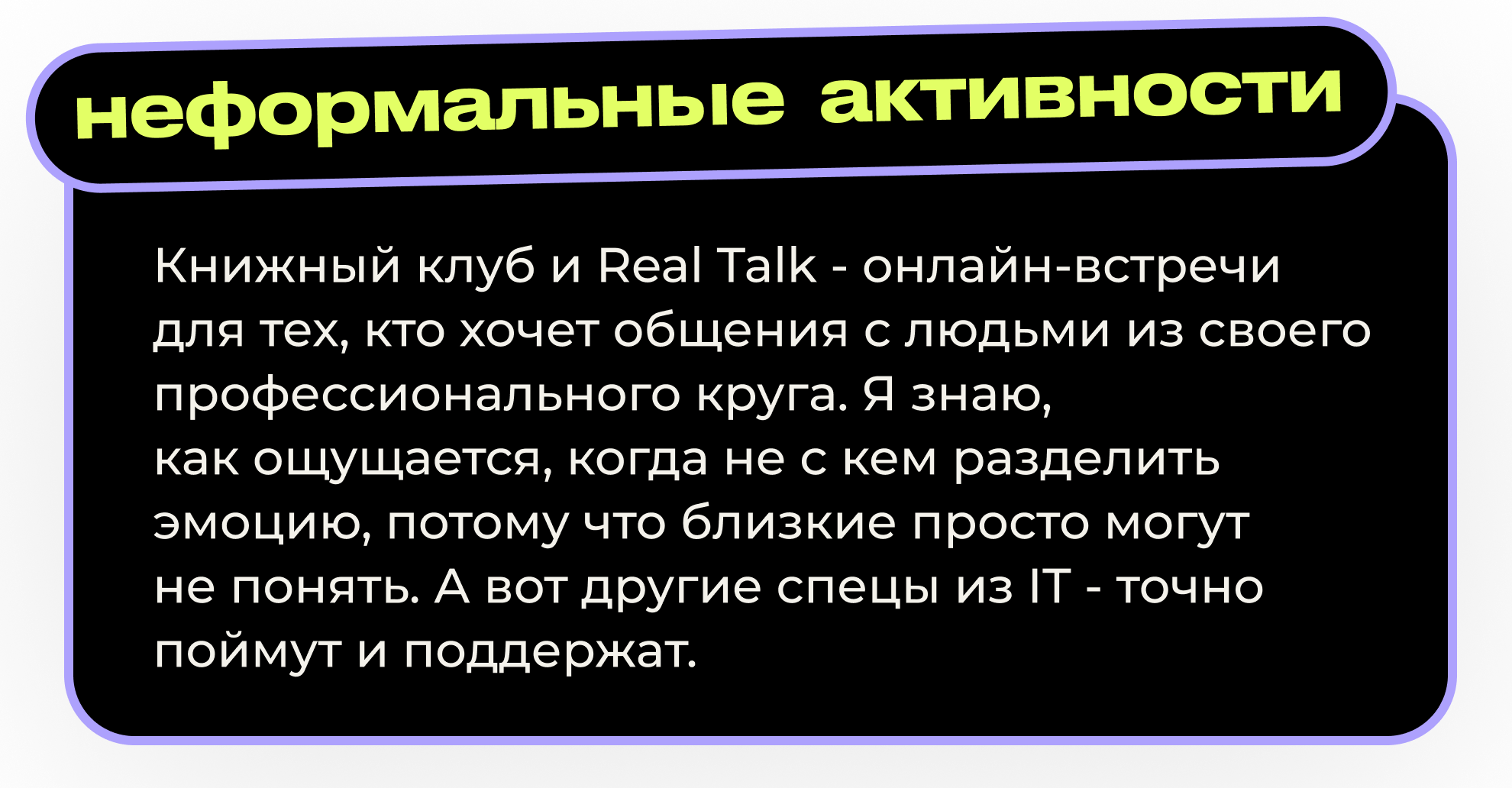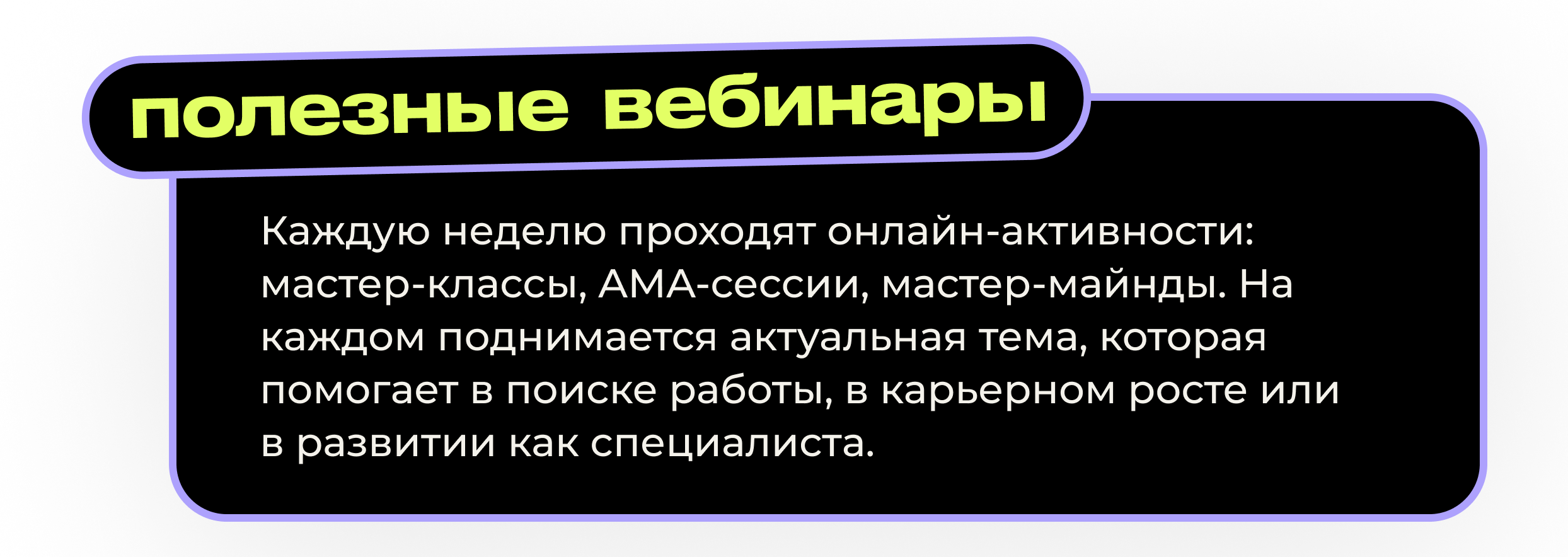 Сообщество действительно ориентировано на разработчиков — именно они составляют основу нашего коммьюнити. Однако, помимо чата с IT-специалистами, у нас проходят разнообразные образовательные активности, которые могут быть полезны всем, кто работает с технологиями или планирует развиваться в этой сфере.